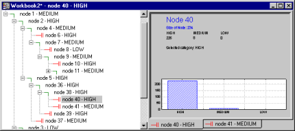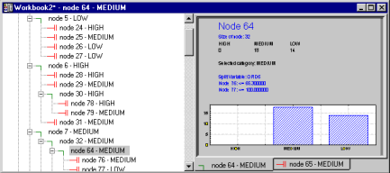 In addition to simple summary tree graphs, you can display the results trees in intuitive interactive tree-browsers that allow you to collapse or expand the nodes of the tree, and to quickly review the most salient information regarding the respective tree node or classification. For example, you can highlight (click on) a particular node in the browser-panel and immediately see the classification and misclassification rates for that particular node. The tree-browser provides a very efficient and intuitive facility for reviewing complex tree-structures, using methods that are commonly used in windows-based computer application to review hierarchically structured information. Multiple tree-browser can be displayed simultaneously, containing the final tree, and different sub-trees pruned from the larger tree, and by placing multiple browsers side-by-side it is easy to compare different tree structures and sub-trees. The Statistica Tree Browser is an important innovation to aid with the interpretation of complex decision trees.