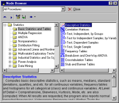 At the heart of Statistica Data Miner is a set of more than 300 highly optimized, efficient, and extremely fast Statistica procedures embedded in user-selectable nodes, which are used to specify the relations between the procedures (objects) and control the logic of the project (and the flow of data). This flexible, customizable architecture delivers the full functionality of all Statistical and analytic procedures to the data mining environment as self-contained analysis objects. Behind each node, and accessible to advanced users of the Statistica Data Miner system, are simple scripts (analysis objects encoded in industry-standard Visual Basic) that serve as the wrappers or glue for defining the flow of data through the project, while the actual numerical analyses are performed via the extremely fast analytic procedures of Statistica . These objects, which can be used as the nodes for data cleaning and/or filtering, and for analyzing the data, are organized in the Node Browser.