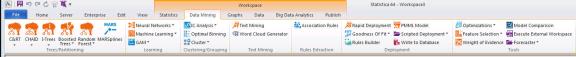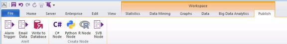 Nodes are flexible and easy to use together in a single workspace project. Workspace nodes can be accessed from the Node Browser, and from the tab/menu structure. When a workspace is active, the Statistics, Data Mining, andGraphs, tabs change to theWorkspace node tabs. Additional tabs become available. Select an analysis or tool from the tabs to add that node to the workspace. Visually, Statistica indicates this by highlighting the tabs as seen here.