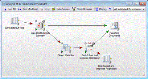 The Select Variables node may be necessary when using a combination of new nodes and scripted nodes in one workspace. In the following example, the Data Health Check Summary node output is used as input for the scripted regression node, Best-Subset and Stepwise Regression. To use this new node output as input, variable selections must be made before the scripted node as shown below.