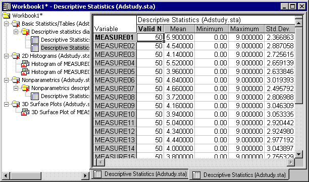 Workbooks are the default way of managing output. Each output document ( a Statistica Spreadsheet or Graph, as well as a Microsoft Word or Excel document) is stored as a tab in the workbook.