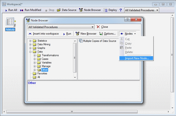- Open a workspace in Statistica. Click Node Browser, and browse to the folder where you want to insert the new node.