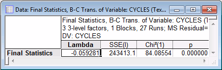 In the Final statistics spreadsheet, the Chi-square value of .941770 with 1 degree of freedom is insignificant, indicating that the Residual sum of squares is not significantly reduced by using the Box-Cox transformation of the Log_Cycl variable with a value of lambda of .628228. The logarithmic transformation of the Cycle dependent variable appears to be adequate.