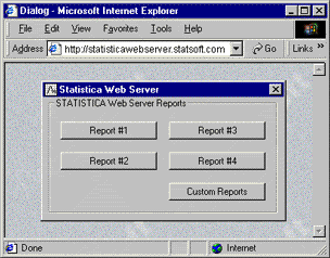 For example, if employees travel but still need rapid access to specific analytic results, a set of specific, most commonly used analyses could be prepared and made accessible to them by a custom, simple browser dialog like the one shown below. Industry standard, easy to use tools are provided to develop such custom sets of predefined analyses and to make a simple set of buttons that run these analyses accessible to users who will log into Statistica via their Internet browsers.