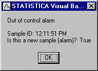 Note how the sample name is passed into the event handler routine as an array of strings; for some alarms such as runs tests, chart violations (alarms) apply to ranges of samples. Also, variable NewSample is a logical (boolean) variable that is true, if the current sample is a new sample (read for the first time into the chart object; see also General Design and New Features).