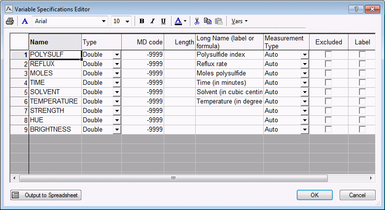 Box and Draper (1987, page 115) report a study of the manufacture of certain dyestuff. The dependent variables of interest are the Strength, Hue, and Brightness of the resulting product. The particular process under investigation was not very well understood in terms of the underlying chemical mechanism; therefore, an empirical study (experiment) was conducted with 6 factors. To view these 6 factors, display the Variable Specification Editor:
