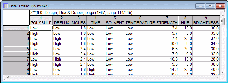 Following are the original settings for the factors; note that text values (Low, High) were also entered to identify the respective settings. You can toggle between text and numeric values in the data file: