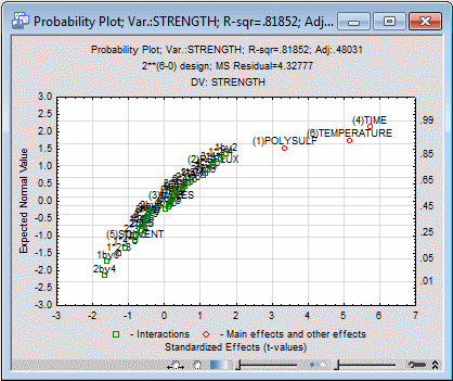 The majority of the main effects and interactions effects are close together, plotted along a line. The sizes of these effects are distributed in the way that one would expect if they were (normal) random around zero. However, the main effects for Polysulfide, Temperature, and Time are clearly separate in the upper-right corner of the plot.