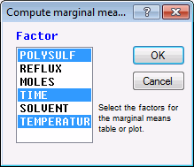 Plot of marginal means. Another plot that is particularly useful for exploring the nature of interactions is the plot of marginal means. Even though there is no indication of any interaction effects in this study, let's look at this graph anyway. On the Quick tab, click the Means plot button to display the Compute marginal means for dialog box. Select the three variables Polysulfide, Time, and Temperature.