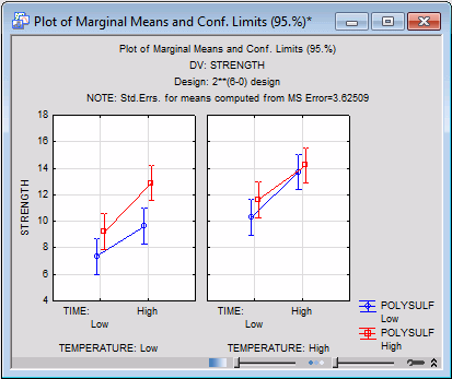 This chart also clearly identifies the main effects for Time, Temperature, and Polysulfide as the most important determinants of resultant Strength.