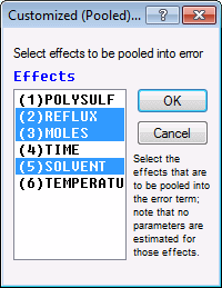 First, pool all non-significant effects into the error term. On the Model tab, select the Ignore some effects check box to display the Customized (Pooled) Error Term dialog box.