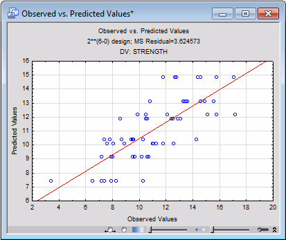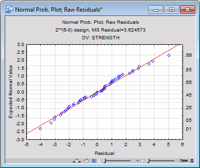 It appears that the residuals follow the normal distribution very closely. Thus, we can conclude that the three-main-effects model provides a good fit for the dependent variable Strength.