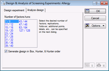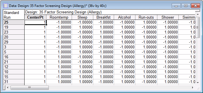 For this study, we want to screen 35 factors, which we can accomplish in 36 runs by choosing the 35/36 Plackett-Burman design. Click on that design now, and then click OK (or double-click on the design) to display the Design of a Screening (Plackett-Burman) Experiment dialog box.