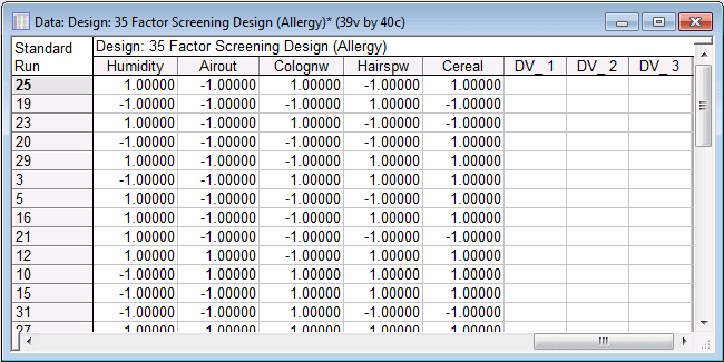 You can now save the design to use as a standard Statistica data file by choosing Save as from the File menu. Note that a completed data file Allergy.sta is already included as an example data file.