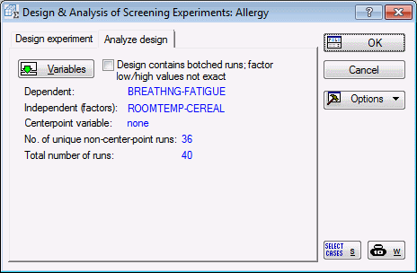 Select Two-level screening (Plackett-Burman) designs and click OK to display the Design & Analysis of Screening Experiments dialog box. Select the Analyze design tab, and click the Variables button. In the variable selection dialog box, select Breathng, Watereye, and Fatigue as the Dependent variables; select variables 1 to 35 as the Independent vars (factors). Click the OK button.