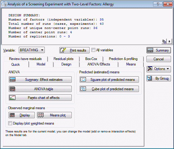 In the Analysis of a Screening Experiment with Two-Level Factors dialog box, set the Variable back to the first dependent variable, Breathng.