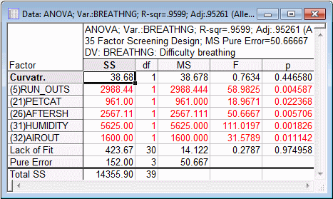 The first row of the spreadsheet contains a check for Curvature. This is a test of the difference between the center point runs and the non-center point runs. If significant, then there is reason to believe that the relationship between some of the factors and the dependent variable is not simply linear in nature. The selected main effects are listed in the following rows, and all of them are Statistically significant.