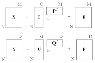 Just as in all regression models, it is the aim of PLS to minimize the residuals F as much possible while also having a representation of the relationship between X and Y that generalizes well for unseen (validation) data. Because of the inner relationship, the principal components used for representing X and Y cannot be calculated separately. In other words, when building the PLS model, the outer relationships should know about each other so they cooperate in building the model as a whole, i.e., build a predictive model capable of relating X to Y. This means that the outer relations cannot be separately handled but rather treated as parts of the same problem. This condition is fulfilled by re-writing the second outer equation as: