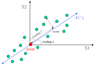A schematic of a toy model consisting of 2-dimensional data represented by a single PC. The "mean" of the original data set serves as the point of origin for the principal component. The transformed value of an observation in X is given by its score, which simply measures its distance from the origin along PC1. Note that the orientation of PC1 is completely determined by its angles (loading factors) with respect to the old coordinate system.