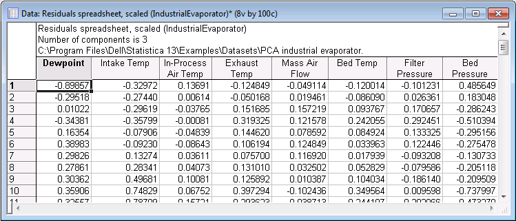 You can also generate a spreadsheet of residuals by clicking the Residuals button. Residuals are the difference between the original data set and the predictions of the PC model. It is that part of the data that could not be explained by the model. Large values of residuals may indicate too simple a model (i.e., a model with an insufficient number of principal components). Alternatively, they might be an indication of the presence of outliers in the original data. The ability to detect outliers is a clear advantage of Principal Components Analysis that can be used for process monitoring and quality control in many areas of industrial research and production. See also, PCA and PLS Technical Notes.
