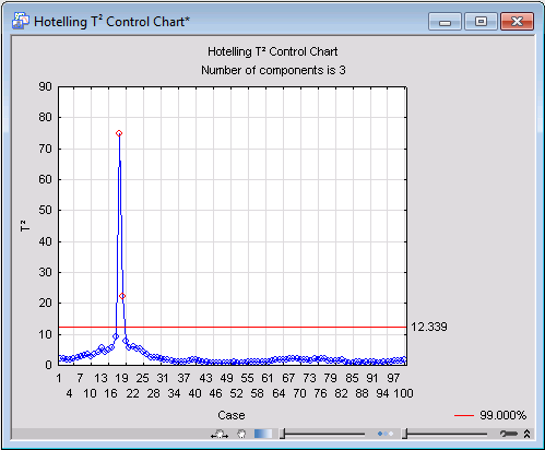 One important chart to review is the so-called Hotelling T2, which can be used to detect moderate (by comparison) outliers. Produce this chart by clicking the T2 chart button on the Quick tab.