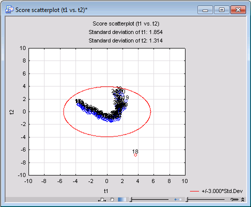 Further casewise data diagnostics can be carried out using the scatterplot of the x-scores. The x-scores are the transformed values of the X observations in the principal component system. An x-score with too high a value (i.e., one that deviates substantially from the point of origin) can again be regarded as an outlier or abnormal. To generate an x-scores scatterplot, select the