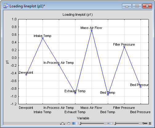 An examination of the plot shows that variable In-Process Air Temp is the least influential in determining the first principal component while Bed Temp plays the most significant important role. This conclusion is confirmed by the spreadsheet and histogram plots of the variables' importance (Variable importance button on the