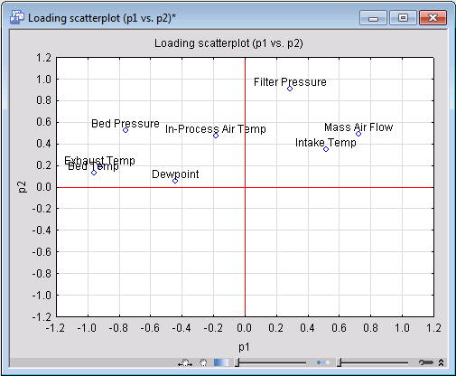 Study of this graph shows a noticeable amount of clustering among the variables. Variables placed close to each other influence the PCA model in similar ways, which also indicates they are correlated. Mass Air Flow and Intake Temp are examples of such variables with a substantial degree of correlation. In fact, the scatterplot of these two variables (which you can generate by clicking Scatterplot on the Statistica Graphs tab) show a nonlinear trend between the two.
