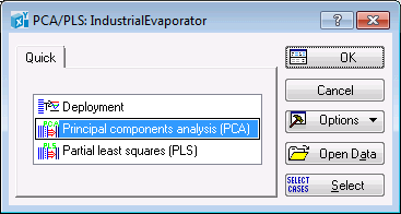On the Quick tab of either dialog box, select Principal component analysis (PCA) and click the OK button to display the PCA dialog box. You can also double-click Principal component analysis (PCA) to display the dialog box.