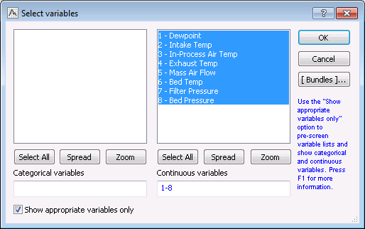 On the Quick tab, click the Variables button to display a variable selection dialog box. Select variables 1 through 8 as the Continuous variables for the PCA analysis.