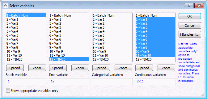 Select v12 - TIME0 as the Time variable. This will further identify cases of the measurement variables with a particular time slot. Thus, by selecting a batch and a time variable, we can uniquely associate the measurements of the process variables to a particular time slot within a batch.