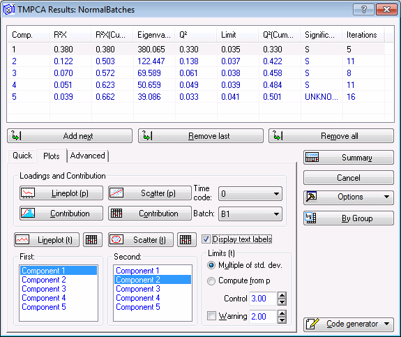 The settings discussed above will determine not only the results, but also the quality of your model, i.e., its ability to predict unseen examples and detect important features that might be present in the data, such as outliers. In the context of batch processing, outliers can be an indication of abnormal batches. Detecting such batches is one of the primary goals of process monitoring in quality control. Note that each analysis is unique, and care should be taken in configuring its settings.
