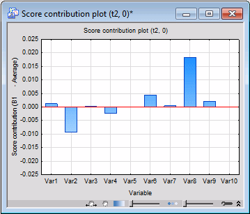 Another useful graph you can produce is the variable contributions to the scores of a principal component for a specific batch and time slot. Click the Contribution button with the graph icon:
