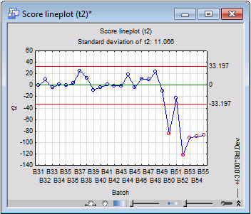 Further batch diagnostics can be carried out using the scatterplot of the t-scores. The t-scores are the transformed values of the process variables in the principal component system. A t-score with too high a value (i.e., one that deviates substantially from the point of origin) can be regarded as a sign of abnormality.
