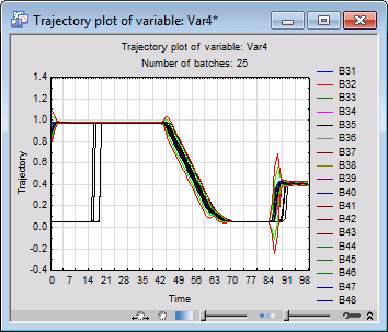 Finally, we can further analyze our batch model by examining the trajectory of its process variables. On the Advanced tab, select Var1 from the Trajectory drop-down menu, and click the Trajectory button with the graph icon: