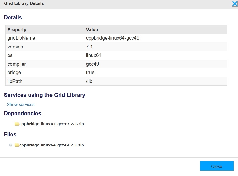 You can also show details for a Grid Library by clicking its name in the list. This opens a Grid Library Details window, which displays the following: