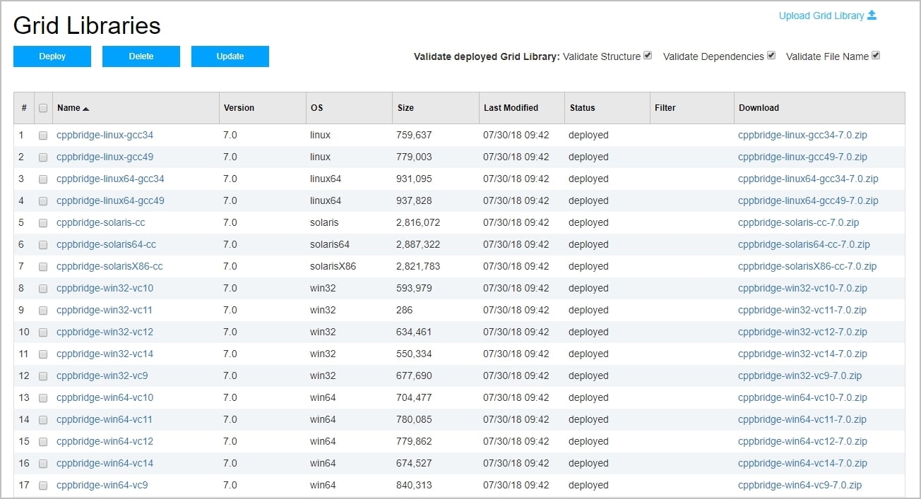 The Grid Libraries page displays a list of Grid Libraries. To upload a Grid Library or Filter, click Upload Grid Library at the top of the list. Click Choose File, browse to a file, then click Upload. This transfers the file into the staging directory. To download a Grid Library, click the file name in the list.