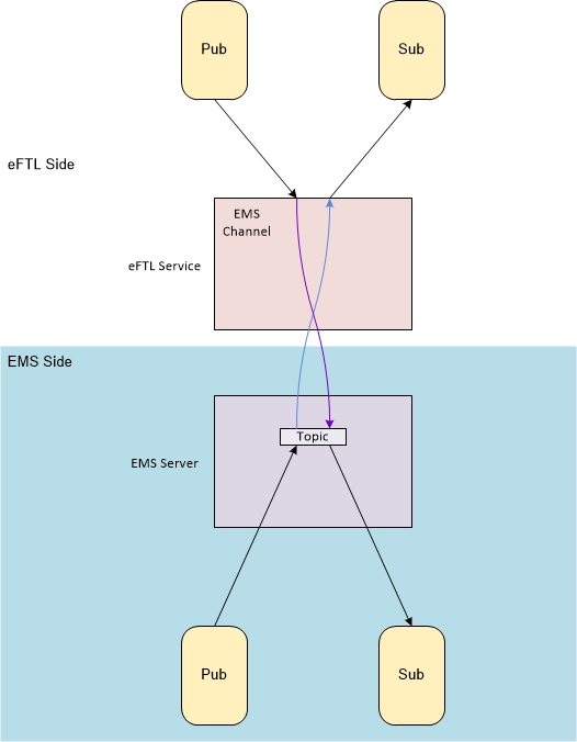 All messages that flow through an EMS channel must pass through the EMS server, even messages that travel from eFTL publishers to eFTL subscribers. The EMS channel forwards messages to the EMS server, which delivers them back to the channel, which in turn forwards them back to the eFTL side.