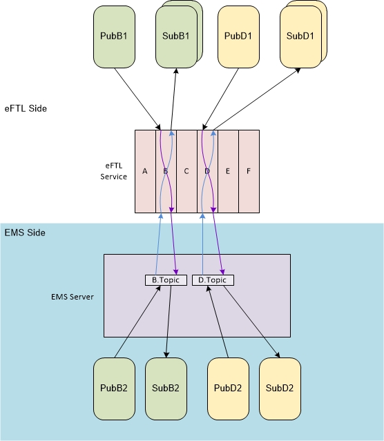 To prevent crosstalk, the eFTL administrator can supply a distinct prefix string for each EMS channel. Each EMS channel prepends its prefix string to EMS topic names at each publish and subscribe operation. The second diagram illustrates the result: each channel communicates with a separate topic in the EMS server, effectively isolating their message streams.