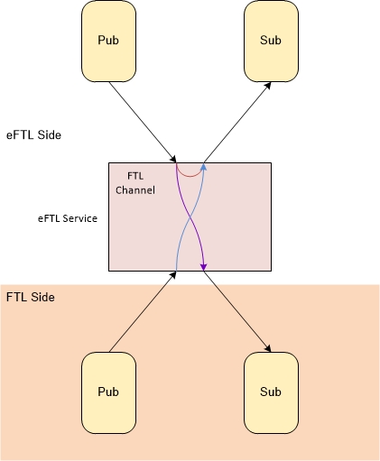 - The red arrow indicates forwarding within the eFTL side: that is, from eFTL publishers to eFTL subscribers, through the FTL channel.