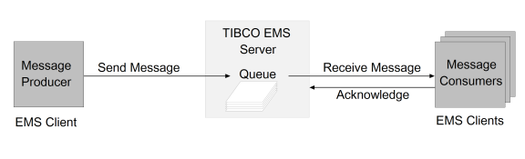 The following image illustrates point-to-point messaging using a non-exclusive queue. Each message consumer receives a message from the queue and acknowledges receipt of the message. The message is taken off the queue so that no other consumer can receive it.