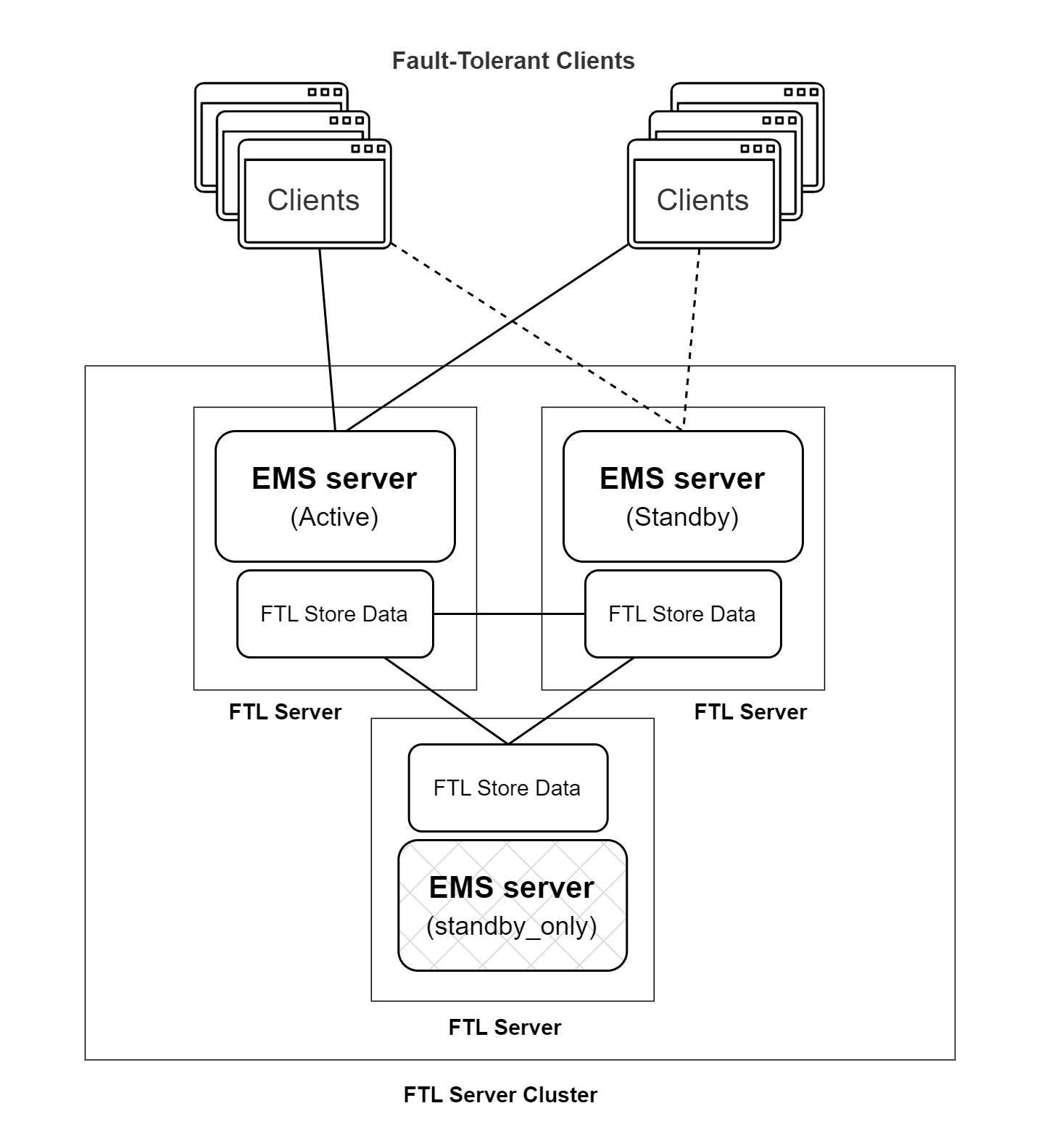 The fault-tolerant EMS server pair makes use of the connections between the FTL servers in the cluster for fault-tolerance related communication. This means that the specifics of fault-tolerance are handled by the FTL server cluster rather than the EMS servers themselves. The majority of EMS server parameters and options relating to configuration of fault-tolerance are not applicable when using FTL stores.