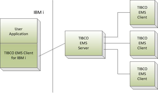 - Other TIBCO EMS clients communicate with the IBM i application through the TIBCO EMS server.