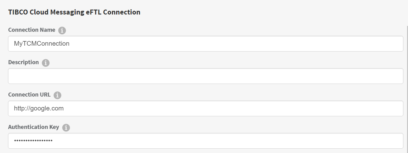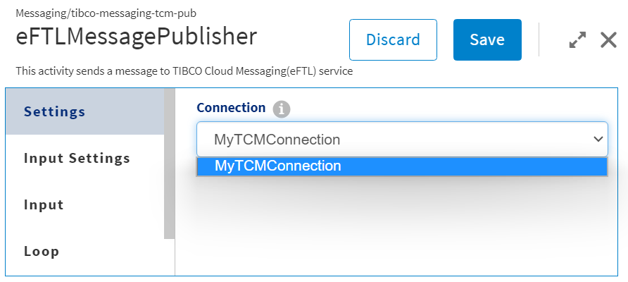 Once the connection is created, you can use it to configure the Connection field in an Activity. In the example below, the connection created above is being used to configure the Connection field of the TIBCO Cloud Messaging eFTL Connection Activity.