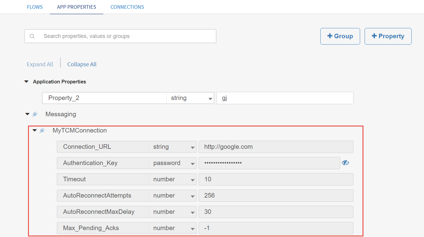 You begin by creating a connection. In the example below, only the Connection URL and Authentication Key fields support app properties.