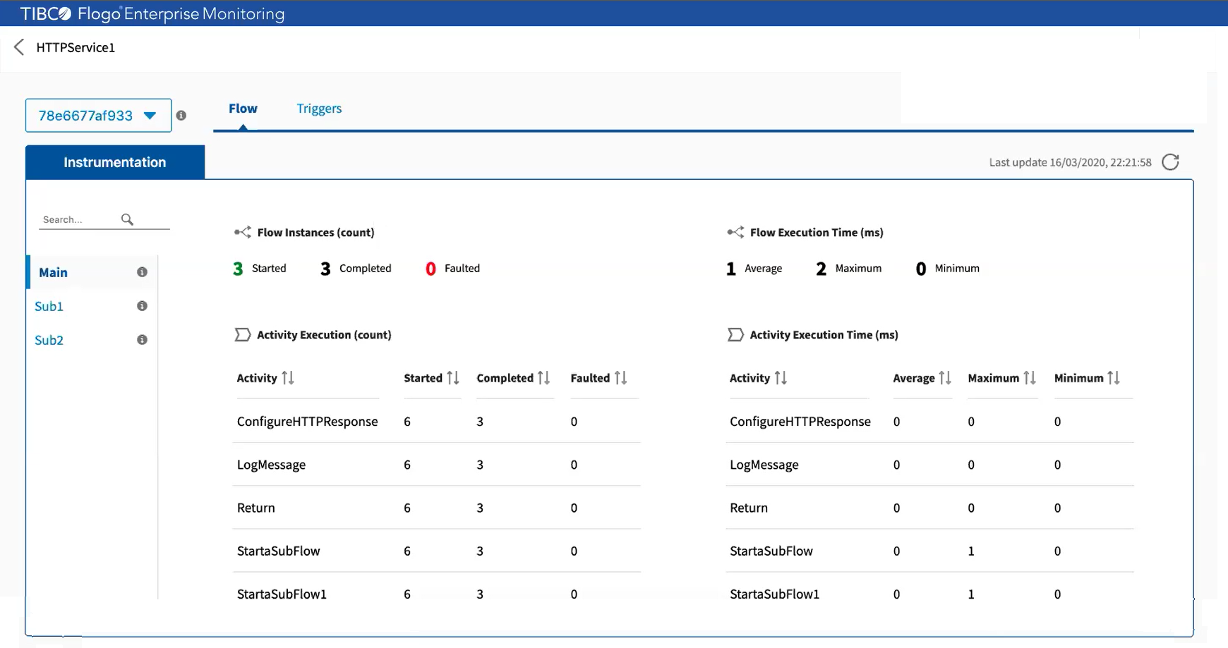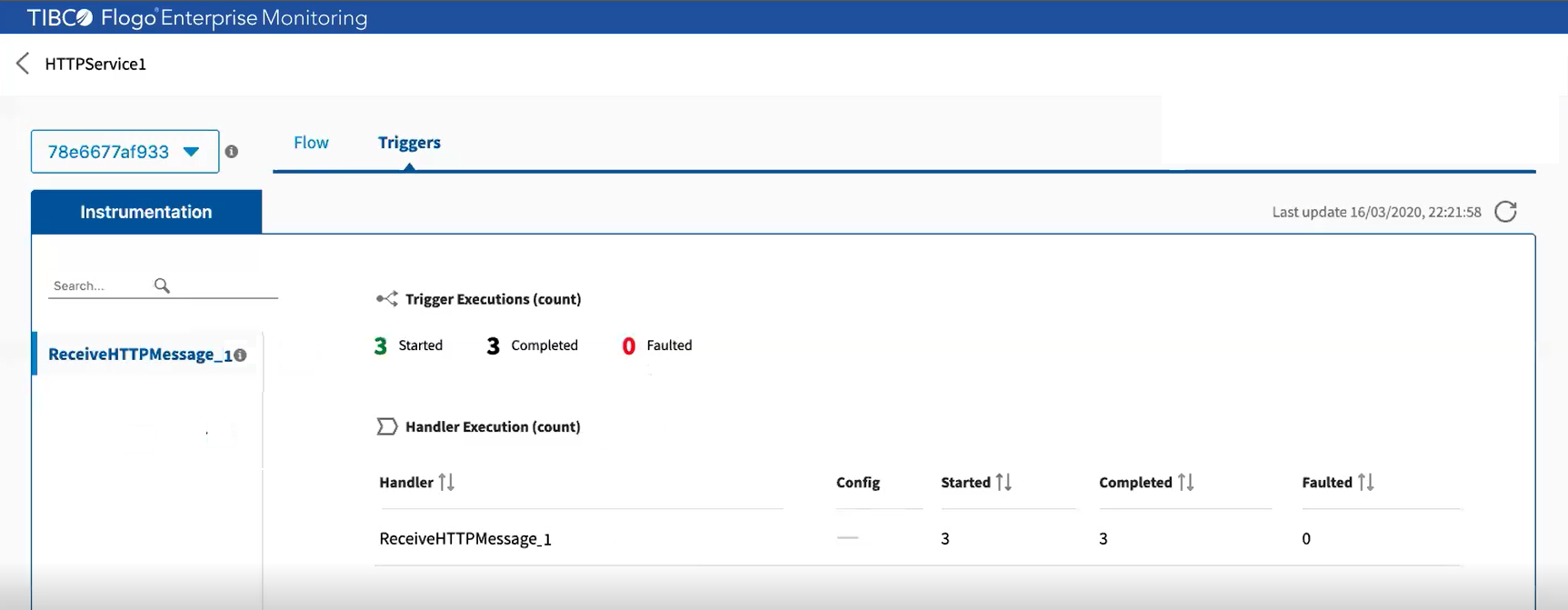 Select an instance ID from the instance ID list in the upper-left corner of the page. The instrumentation statistics of flows and triggers are displayed on the Flow tab and Triggers tab.