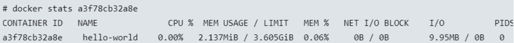 The docker stats command returns a live data stream for running containers. To limit data to one or more specific containers, specify a list of container names or ids separated by a space.