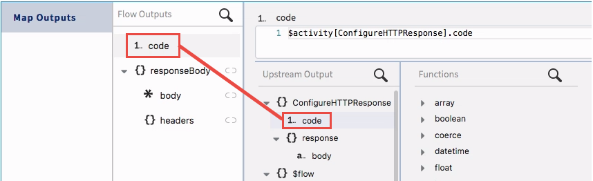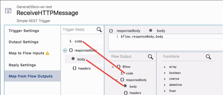 - In the Map from Flow Outputs tab in the ReceiveHTTPMessage trigger, map the code and body to the corresponding elements from the flow output.