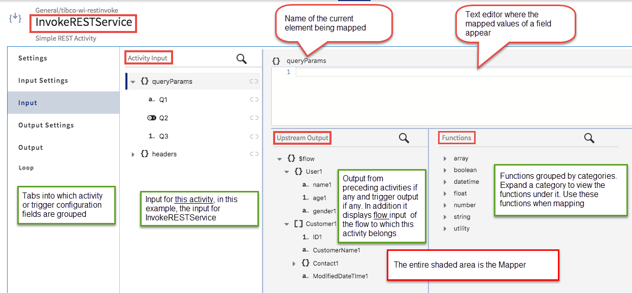 When you click an activity or trigger on the flow details page, the configuration page for that activity or trigger opens. The following image is an example of the configuration page that opens if you clicked on the InvokeRESTService activity. The image describes the areas of the Mapper.