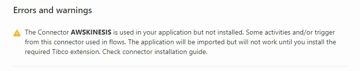 When an activity or trigger used in an app being imported is missing from your Flogo Enterprise environment, the flows in the app get imported, but you see a warning in the Import App dialog.